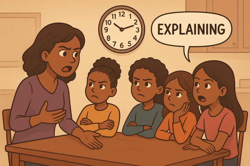 She’s out here negotiating peace treaties at 7 AM with children who swear they’re “not arguing,” they’re just “explaining.”